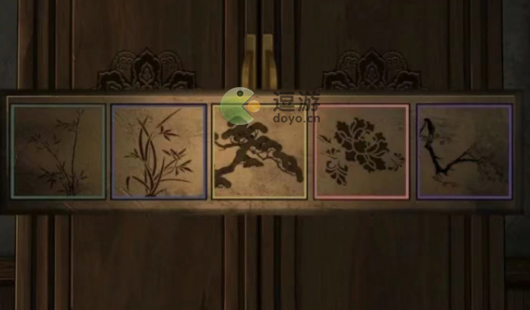 23、点击柜子上的密码锁,根据上面的颜色顺序(绿蓝黄粉紫),结合衣服的款式和花样,调整至正确的图案(绿:竹子、蓝:兰、黄:松、粉:菊花、紫色:梅花)